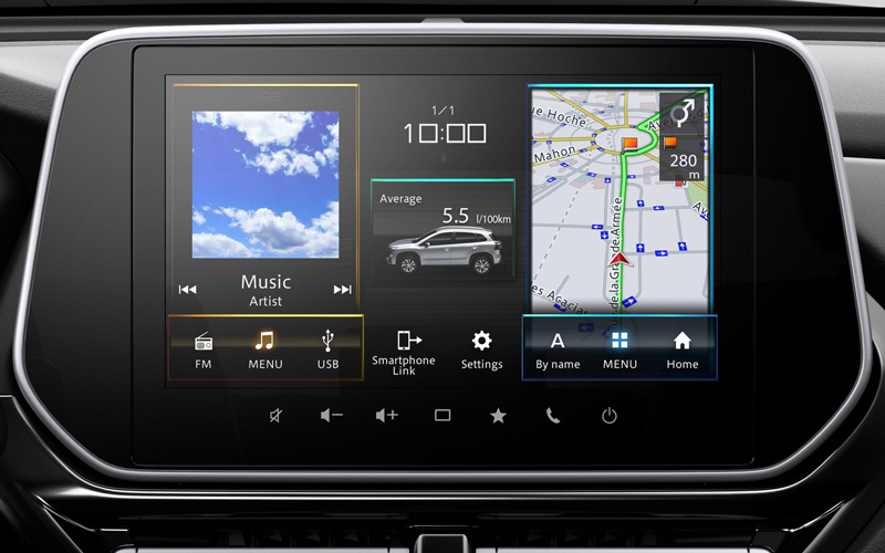 Получайте удовольствие от приложений беспроводной связи Apple CarPlay® или Android Auto™, функции распознавания речевых команд и звонков по громкой связи по Bluetooth®. Можно слушать музыку или даже смотреть фильмы с USB. Сообщая о состоянии автомобиля, система также отображает такую информацию, как экономия топлива, пробег, расход энергии гибрида, предупреждения и данные с камеры заднего вида.