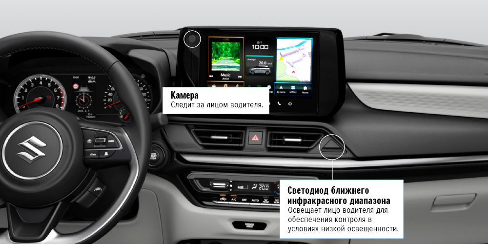 Камера, установленная рядом с дисплеем, следит за лицом водителя и фиксирует открытие/закрытие глаз, направление взгляда и лица. Если система обнаруживает сонливость или рассеянность водителя, она подает звуковой сигнал и выводит предупреждающее сообщение на информационный дисплей.
