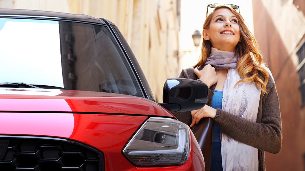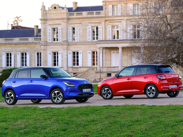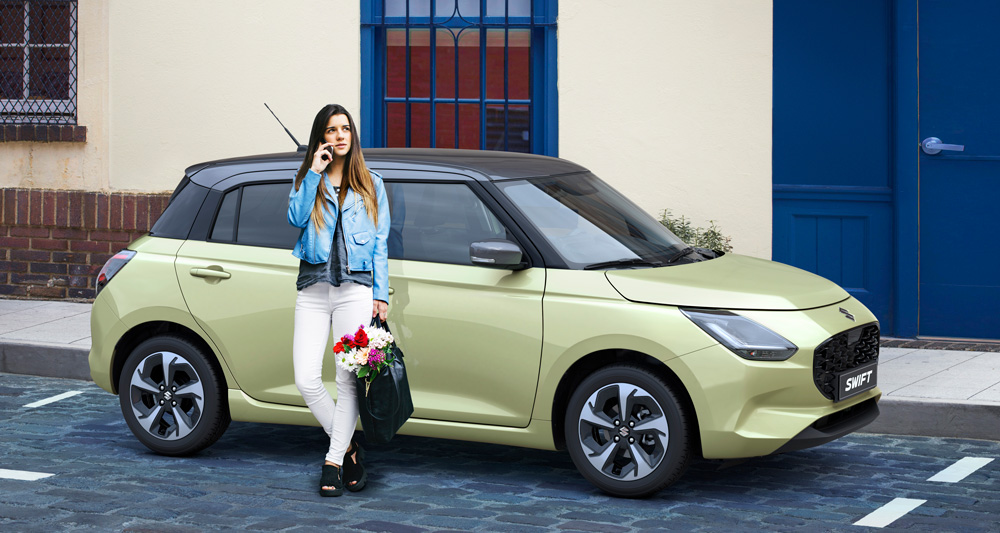 Черные стойки A и B создают впечатление «парящей» крыши. Яркая боковая линия делает автомобиль безошибочно узнаваемым: типичный Swift, просто другой.