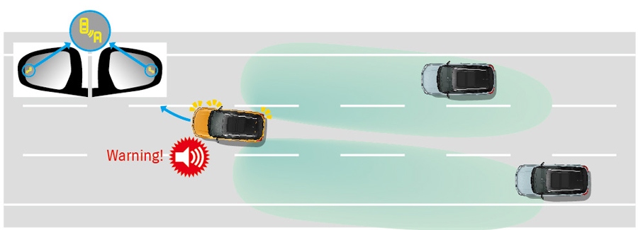 Перестроение в другой ряд на скоростях выше 15 км/ч стало безопаснее благодаря установке сзади двух боковых радарных датчиков, способных обнаруживать автомобили, находящиеся или приближающиеся сзади в слепых зонах с обеих сторон. При обнаружении или приближении автомобиля в задней слепой зоне на соответствующем наружном зеркале загорается предупреждающий светодиодный значок. Если водитель включает сигнал поворота для перестроения, мигающий значок дополняется предупреждающим звуковым сигналом.
