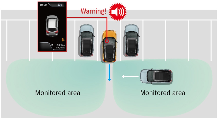 На скоростях до 8 км/ч при движении задним ходом автомобиль использует два установленных сзади радарных датчика, предупреждая водителя о наличии автомобиля с любой стороны во время выезда со стоянки задним ходом. При обнаружении автомобиля водитель получает визуальное предупреждение на многофункциональном дисплее и звуковой сигнал. Это помогает водителю безопаснее маневрировать при выезде со стоянки, когда его поле зрения ограничено с обеих сторон автомобиля.